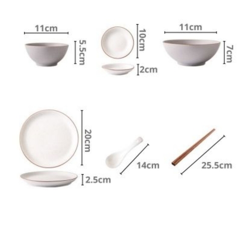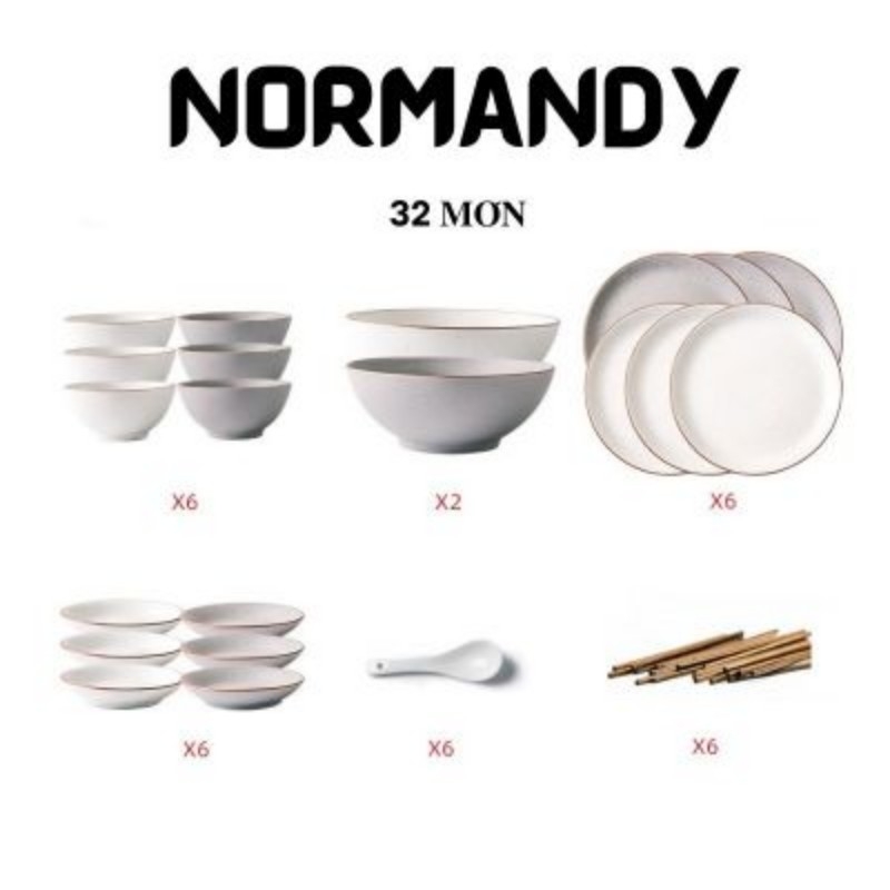 06 chén cơm + 06 dĩa gia vị + 2 tô canh+ 06 dĩa tròn lớn + 06 đũa + 06 muỗng