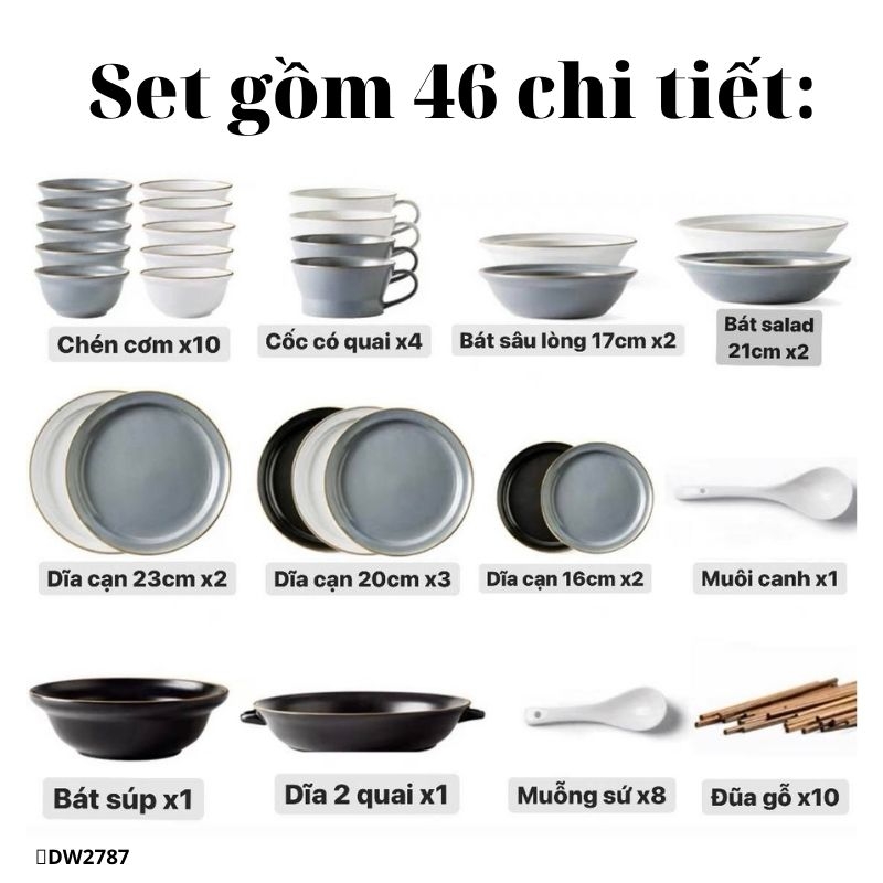 - Gồm: 10 chén cơm, 4 chén soup có quai, 2 tô sâu lòng 17cm, 2 tô 21cm, 2 dĩa cạn 23cm, 3 dĩa cạn 20cm, 1 muôi canh, 1 tô salad lớn, 1 dĩa 2 quai lớn, 8 muỗng sứ và 10 đôi đũa gỗ